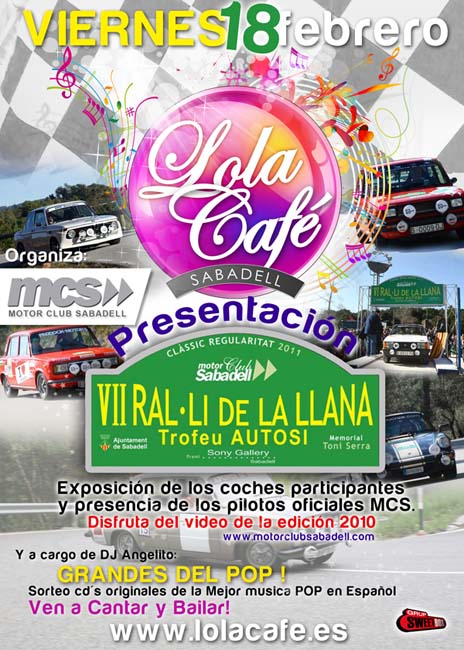 Presentació del VII Ral·li de la Llana Trofeu Autosi, al Lola Cafè de Sabadell El divendres dia 18 de febrer, a partir de les 23:30 hores, farem una presentació "nocturna" del Ral·li de la Llana Trofeu Autosi. El soci i amic Xavi Morlans, ha posat la sala Lola Cafè a la nostra disposició. Allà, uns quants cotxes clàssics a la porta, unes copes de cava gratuïtes pels socis del MCS i els participants de la Llana que vulguin venir, música adient (pop, etc), una sala elegant, el vídeo de la Llana Autosi del 2010 en la pantalla gegant ... en fi, bon ambient !! Ah, que ningú pateixi ... hi ha lloc de sobres per aparcar, res de música alta ni estrident, local idoni, amb barra de fusta, zona de taules per cafès, i zona de ball.