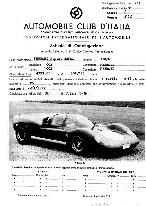 Fitxa d'homologació del 20/1/1970 d'un Ferrari 512/S. |