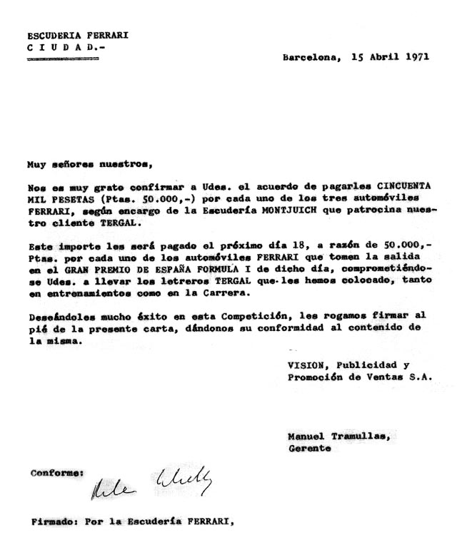 l'any 1971, confirmant un contracte de patrocini de 'Tergal'. |